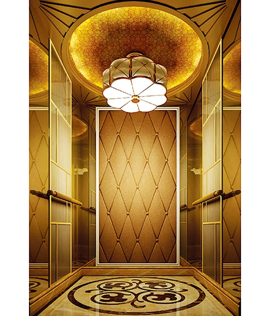Cabin Wall: Titanium gold mirror stainless steel, wood groin trim, leather soft-roll